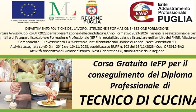 Chiuso IN EVIDENZA MODUGNO | CORSO GRATUITO PER L’ACQUISIZIONE DEL DIPLOMA PROFESSIONALE DI IV° ANNO DI TECNICO DI CUCINA 080.5354919 Modugno IeFP-Diploma Professionale (IV anno)