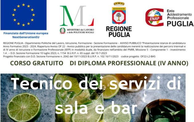Chiuso IN EVIDENZA CORATO | CORSO GRATUITO PER TECNICO DEI SERVIZI DI SALA E BAR 080.3588130 Corato IeFP-Diploma Professionale (IV anno)
